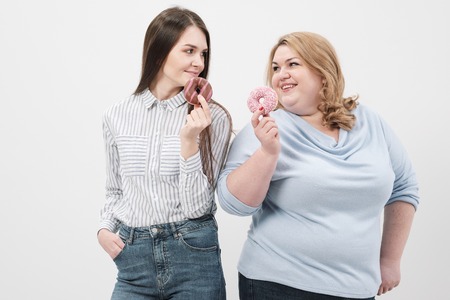 Two girls, thin and fat on a white background, are holding pink glazed donuts in their hands, smiling and joking.