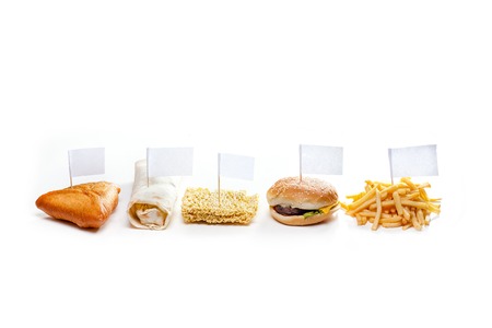Tasty fast food from different countries on white background isolated with flags - mockup
