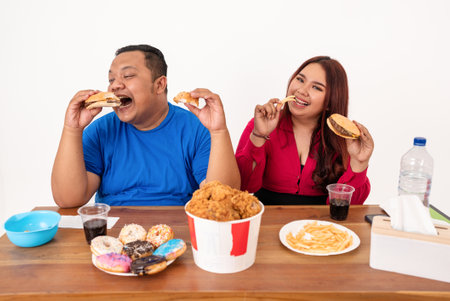Fat Asian Couple Smile Happy Hold the hamburger together. Eating concept Health, weight loss