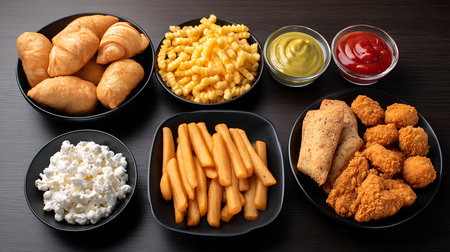 Fast food meal selection on black background. Top view, flat lay