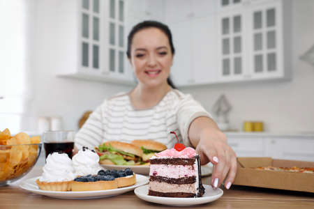 Happy overweight woman at table with unhealthy food in kitchen, focus on cake