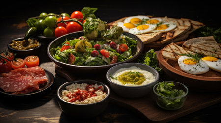 Mediterranean breakfast spread with various items