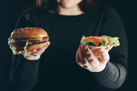 the girl chooses between healthy and delicious food. A fish sandwich and a burger in the hands of a woman. Isolated on a black background. Copy space