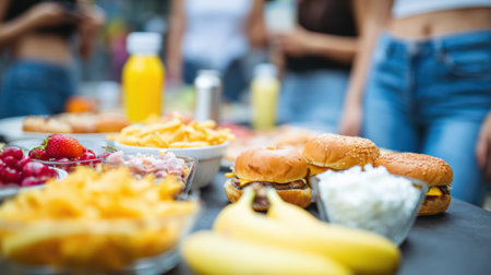 Healthy belly diet food stands out clearly while unhealthy snacks blur in the background at a vibrant outdoor party with friends.