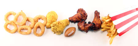 chicken wings, fries and onion rings for football on a table. Great for Bowl football Game