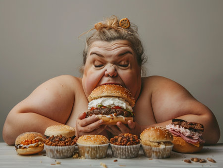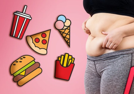 Belly squeezing alongside various high-calorie junk foods highlights concerns about unhealthy diets and weight gain in a dimly lit setting.