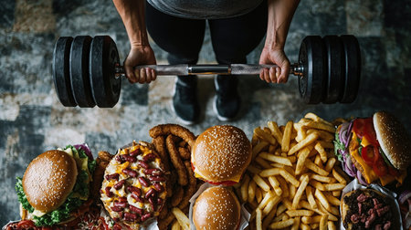 Balancing fitness and indulgence with weights and hearty fast food spread