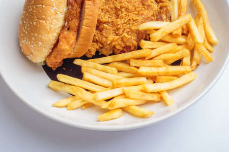 Fried fries and blurred hamburger background. Unhealthy food concept. Delicious fast food. Juicy burger with baked bun, melted cheese, meat patties and vegetables.