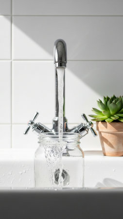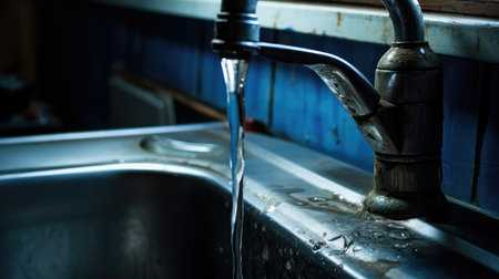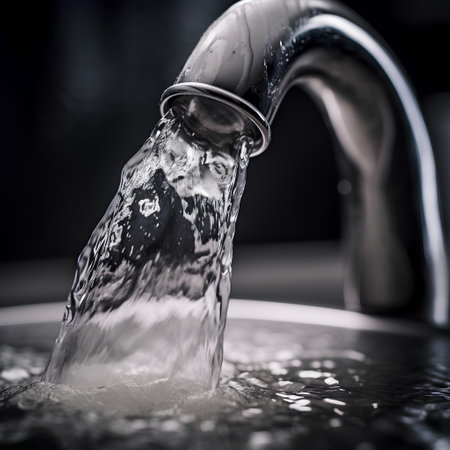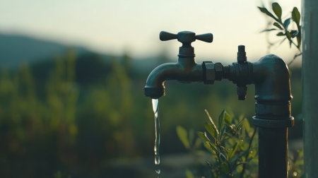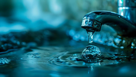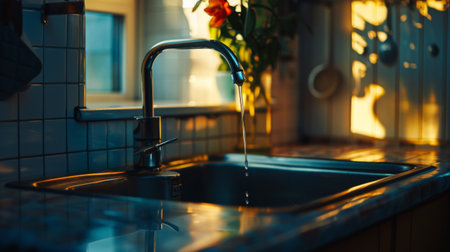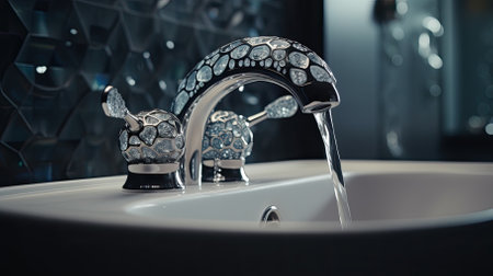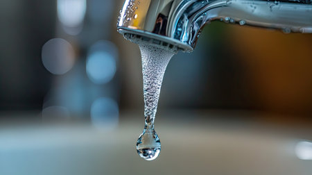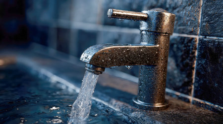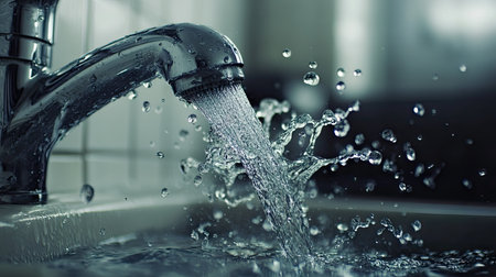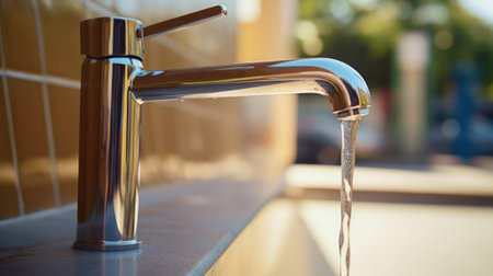 Water flowing from a faucet with droplets sparkling in the light creating a refreshing atmosphere and highlighting the importance of water conservation concept