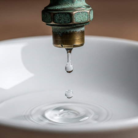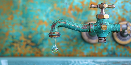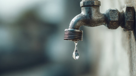 A close-up view of a dripping water tap, emphasizing texture