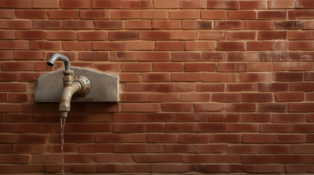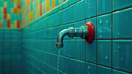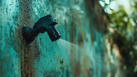 A captivating image of water spraying from a metal faucet mounted on a rustic wall, showcasing urban decay blending with nature. The vibrant teal and brown colors enhance the visual appeal.