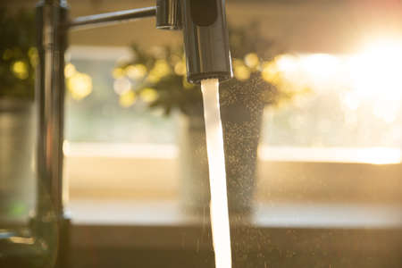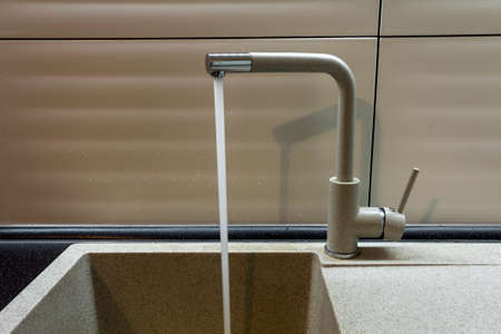 Modern kitchen faucet with running water, blurred background, detail shot, home interior concept