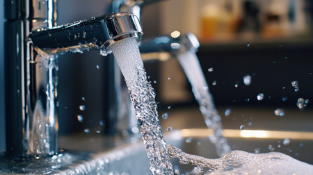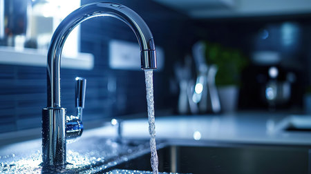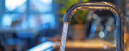 Close-up of running water pouring from a chrome faucet in a modern setting. The crisp water droplets and clean design emphasize freshness and purity, ideal for themes related to hygiene, health, and water conservation.