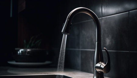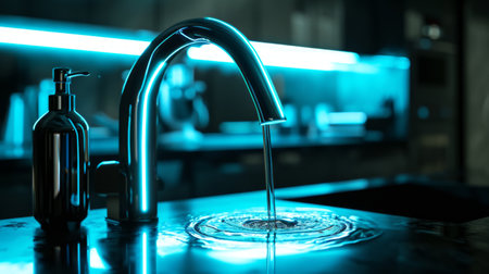 Generative AI Futuristic smart kitchen faucet, LED-lit water display, atmospheric background, sleek and modern depiction