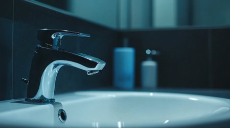 A close-up view of a modern faucet with a sleek design. The calming blue hues and soft lighting create a serene atmosphere in the bathroom setting.