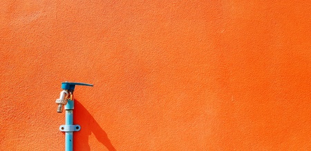 Blue faucet or tap and water pipe installed on orange concrete wall with copy space - Object,