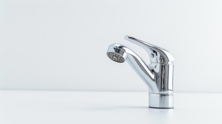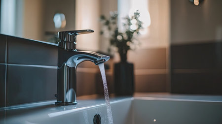 A stunning close-up view of a sleek modern bathroom faucet flowing water, showcasing contemporary design and tranquil atmosphere ideal for home decor.