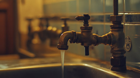 Generative AI Vintage-style bronze kitchen faucet, rustic charm, detailed knobs, atmospheric water droplets, intricate linework