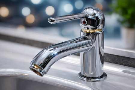 Modern chrome faucet close up over white ceramic sink in bathroom with warm light and blurred background