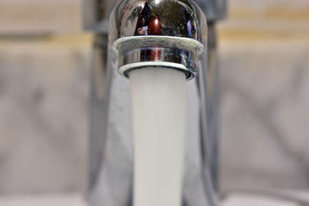 Pure and clear tap drinking water flows from the tap. Chrome plated fixtures are worn and have scratches and patches. Cleaning and hygiene in the bathroom. Close-up.