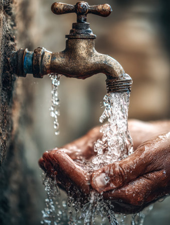A weathered metal tap drips slowly onto open palms, evoking themes of patience, reliance, and the passage of time in a rustic outdoor setting.
