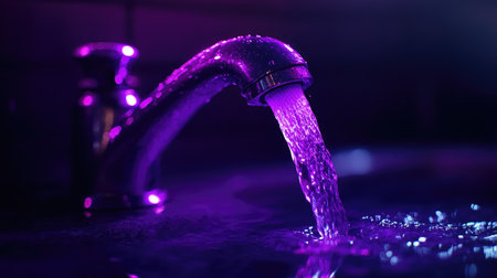 A vibrant stream of water cascades from a stylish tap, illuminated by a soft purple light, creating mesmerizing reflections and soothing bubbles on the water surface.