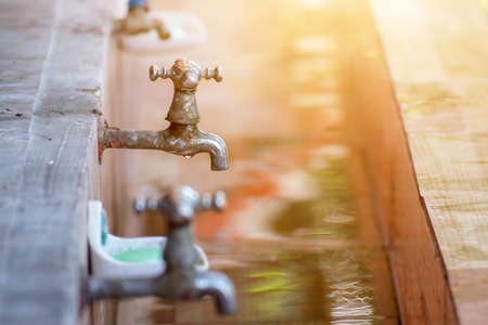 Old faucet in row,old valve faucet with dirty blass faucet in old tub on school children