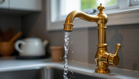 A golden faucet with water flowing gracefully, showcasing elegance and modern design in kitchen setting. droplets glisten, adding touch of luxury