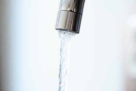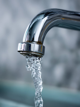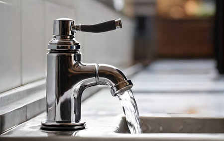 Close-up view of a modern faucet with flowing water in a bright bathroom setting, highlighting elements of cleanliness and contemporary design features.