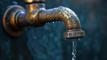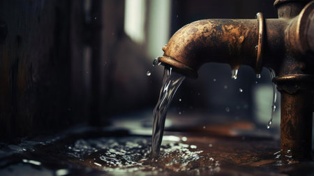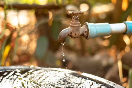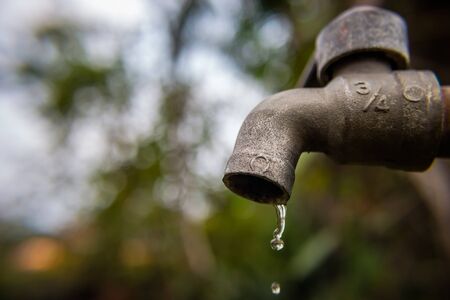 Dirty water flows from a rusty faucet tap. Saving drinking fresh water in the world.