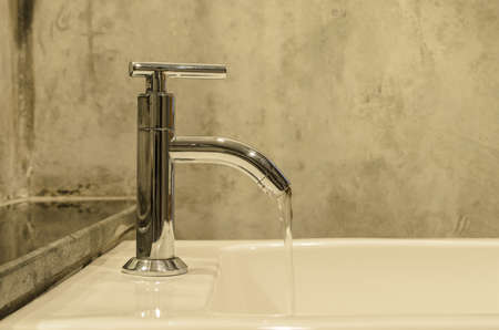 Close up classic faucet on white sink in restroom or bathroom for interior design.