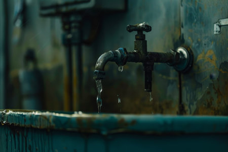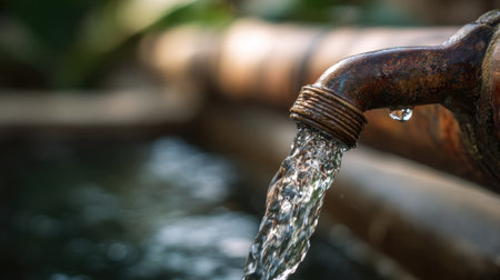 An image captures water gushing from an aged faucet. The metallic texture of the faucet contrasts with the dynamic flow of water. The focus is sharp on the water, while the background is softly blurred. This scene might be suitable for illustrating topics related to resources or environmental concerns.