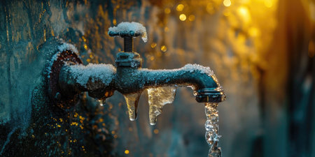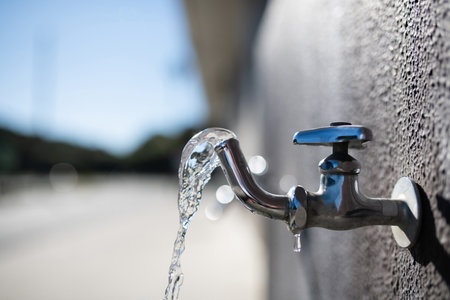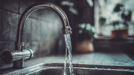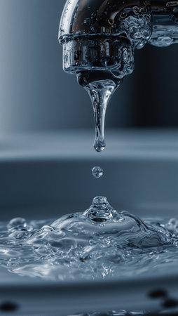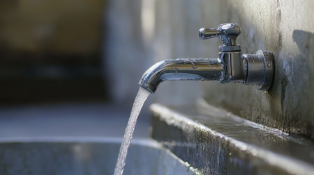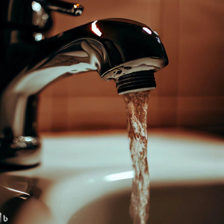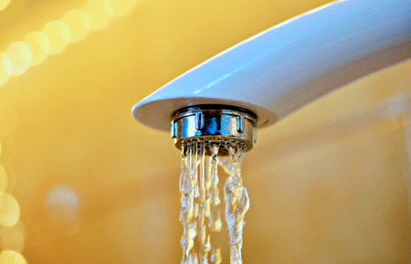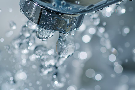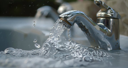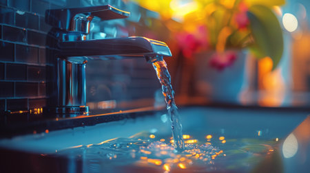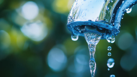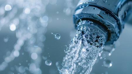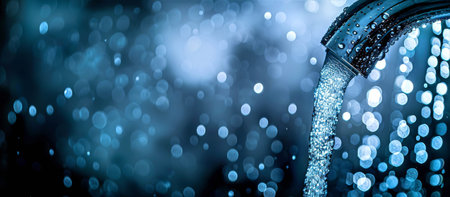 Water flowing from a faucet creating a beautiful bokeh effect with droplets sparkling in the light, representing the concept of hydration and water conservation concept
