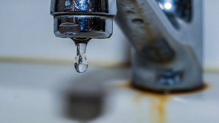A close-up of a leaking faucet with water droplets forming on the spout, highlighting issues of household water conservation.