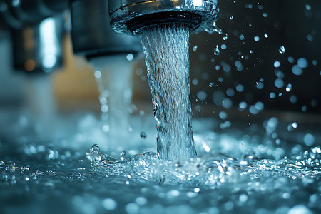Water streams from a faucet into a basin, creating energetic splashes. Bright light reflects off the liquid, emphasizing its clarity. This moment captures the beauty of everyday life.
