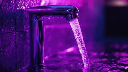 A vibrant purple-lit faucet pours flowing water in a contemporary bathroom, showcasing modern design and creating a serene atmosphere. Ideal for interior inspiration.