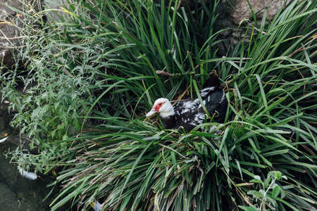 mom wild duck incubates eggs in a nest in the grass