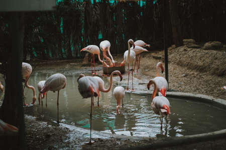 Group of flamingos next to the lake drinking water and live in natural zoo surrounding