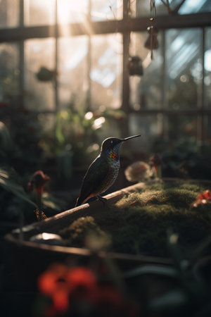 Cute hummingbird sitting on a flower pot in a greenhouse.