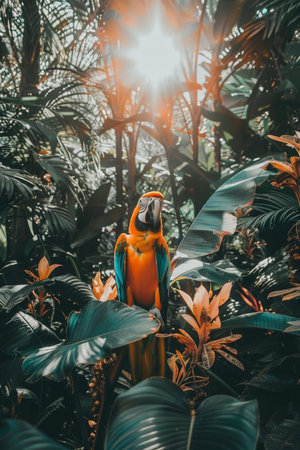 A stunning portrait of a vibrant tropical bird nestled among lush greenery and colorful flora, highlighting nature's beauty and diversity.