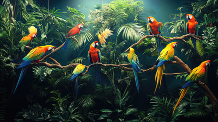 A mesmerizing display of vibrant parrots perched on branches amidst lush tropical foliage. This captivating wildlife scene captures the beauty and colors of nature.