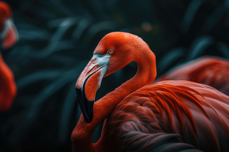 View of pink flamingo, a large bird that are identifiable by their long necks, sticklike legs and pink or reddish feathers