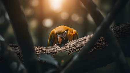 A colorful macaw parrot sleeps peacefully while perched on a thick tree branch in a forest setting. The bird's head is tucked in, and the soft lighting highlights its orange and green feathers against a blurred background. This portrait captures the quiet side of tropical wildlife.