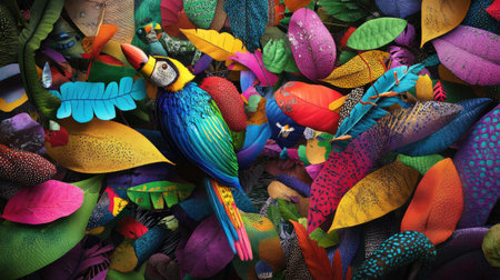 This stunning image captures a colorful tropical bird among an array of vibrant leaves, showcasing the beauty of exotic flora and wildlife in a rich, lush environment.