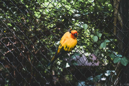 Colorful parrots in the park. Tropical forest. Wildlife scene.
