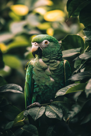 Close up of a mealy amazon parrot showing its vibrant green plumage while perched amidst dense foliage