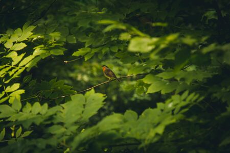 a small bird sits on a branch in dense thickets. forest plants in the summer. wildlife landscape.