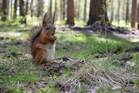 Foxy squirrel with tit, prow and brush sitting on grass near hassock in the wood . Wild furry animal macro.