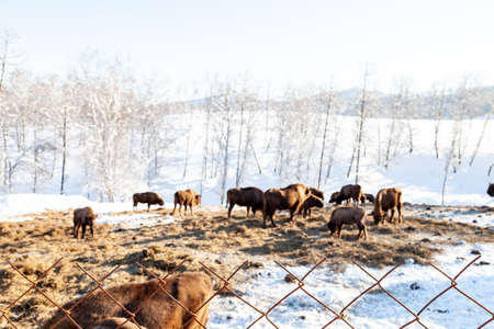 A large herd of brown bison or Wall Street bulls grazes next to a haystack on snow in winter in Russia.