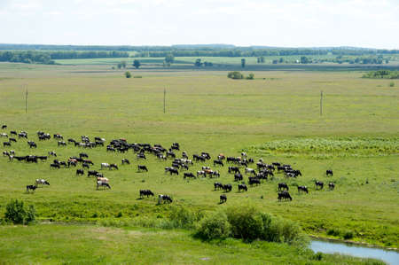 a herd of cows, a large number of summer meadow